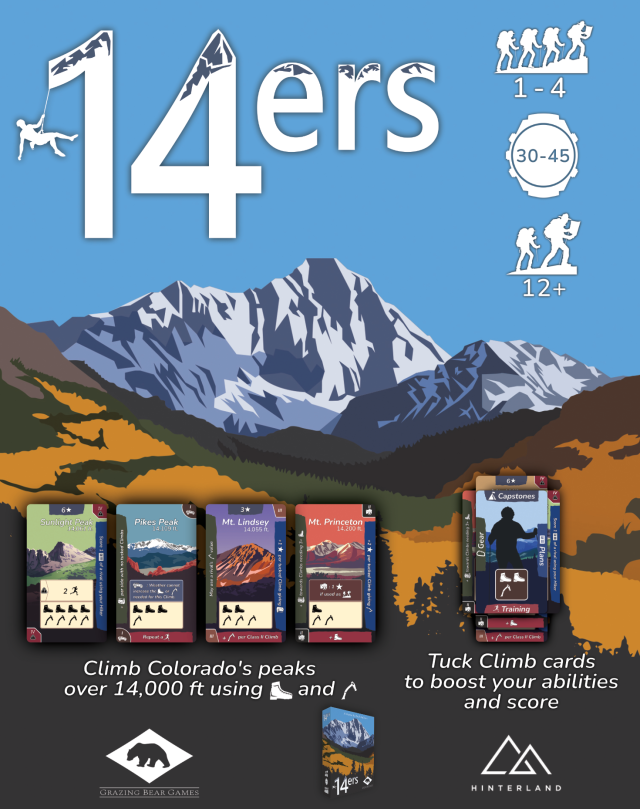 Conquer Colorado’s peaks of 14,000+ feet in this upcoming card game featuring the stunning artwork of Hinterland Outdoors. Sign up for our newsletter below to stay in the loop for our latest game, coming to Kickstarter on Tuesday, October 21!
